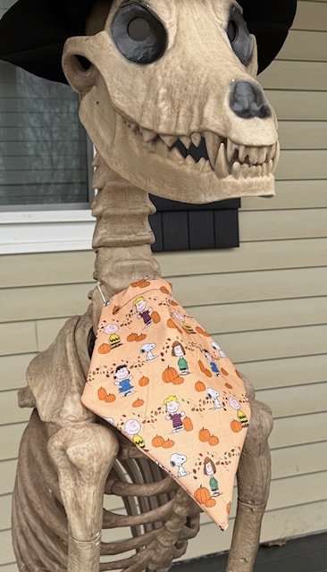 And since I mentioned him… yes, I’ll be sharing a picture. I am NOT a sewer. I literally just got the sewing machine. But hey, it’s an outdoor decoration, and he looks adorable to me. Please don’t judge my stitching, just admire my skelly dog rocking his little Peanuts Thanksgiving bandana.